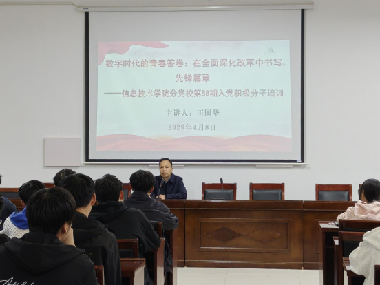 王国华围绕“铸魂·淬炼·赋能”三个关键词展开讲解。他结合党的二十届四中全会精神和“十五五”规划战略部署,深刻阐释了新时代青年特别是信息技术专业学子的使命担当。他指出,入党积极分子要在思想淬炼中把准青春航向,在实践熔炉中锻造过硬本领,在发展变革中成就卓越人生。他强调,面对新一轮科技革命和产业变革,同学们要坚定理想信念,筑牢信仰之基,勇于攻克“卡脖子”技术难题,在急难险重任务中彰显青年担当。同时他勉励全体学员,要德技并修、专通结合、知行合一,以党员标准严格要求自己,以实际行动向党组织靠拢,在全面深化改革、推进中国式现代化的征程中书写无愧于青春的先锋答卷。