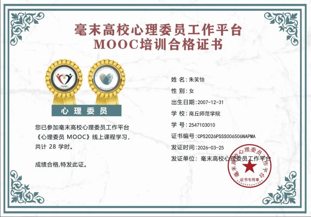 本次培训依托“高校心理委员工作平台”微信公众号开展,平台课程涵盖心理健康知识普及、心理危机识别与干预、朋辈沟通技巧、情绪疏导方法等核心内容,贴合高校心理委员工作实际需求。m88官网统筹安排培训进度,明确学习要求,督促全体心理委员利用课余时间完成线上课程学习、打卡测试与实操练习。参训心理委员态度端正、认真钻研,系统掌握了心理健康工作基础技能,清晰把握了心理委员的职责与工作方法,全部通过考核并获得由平台颁发的心理委员证书。